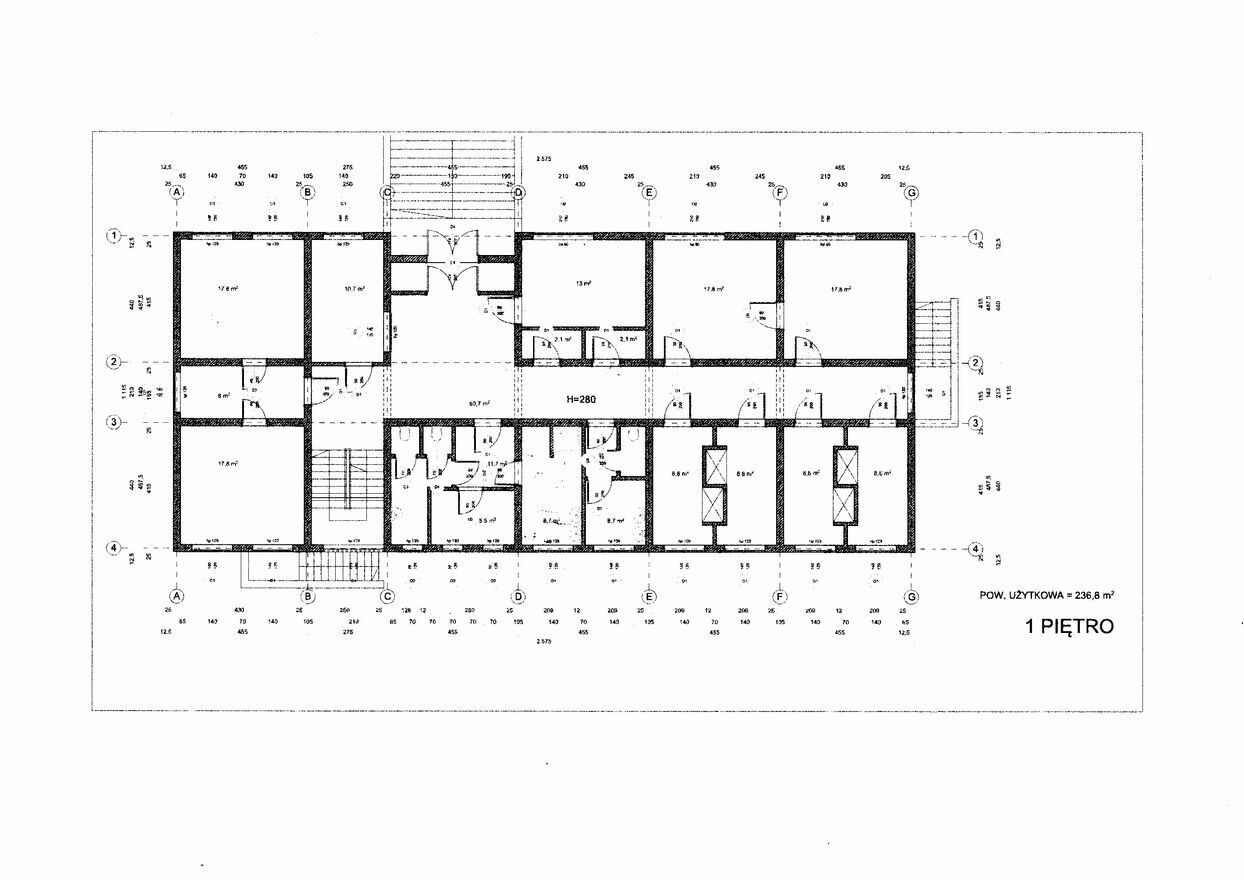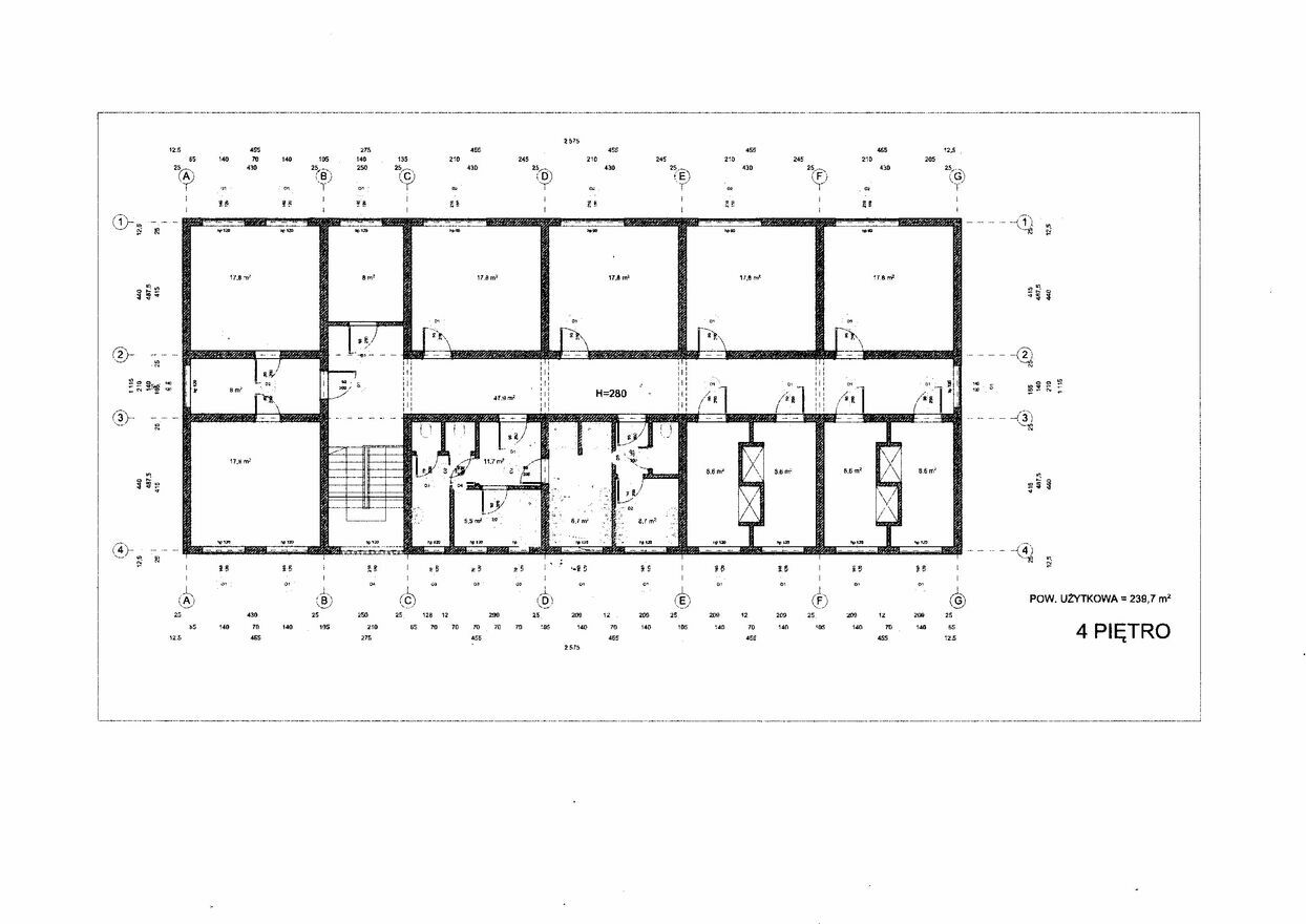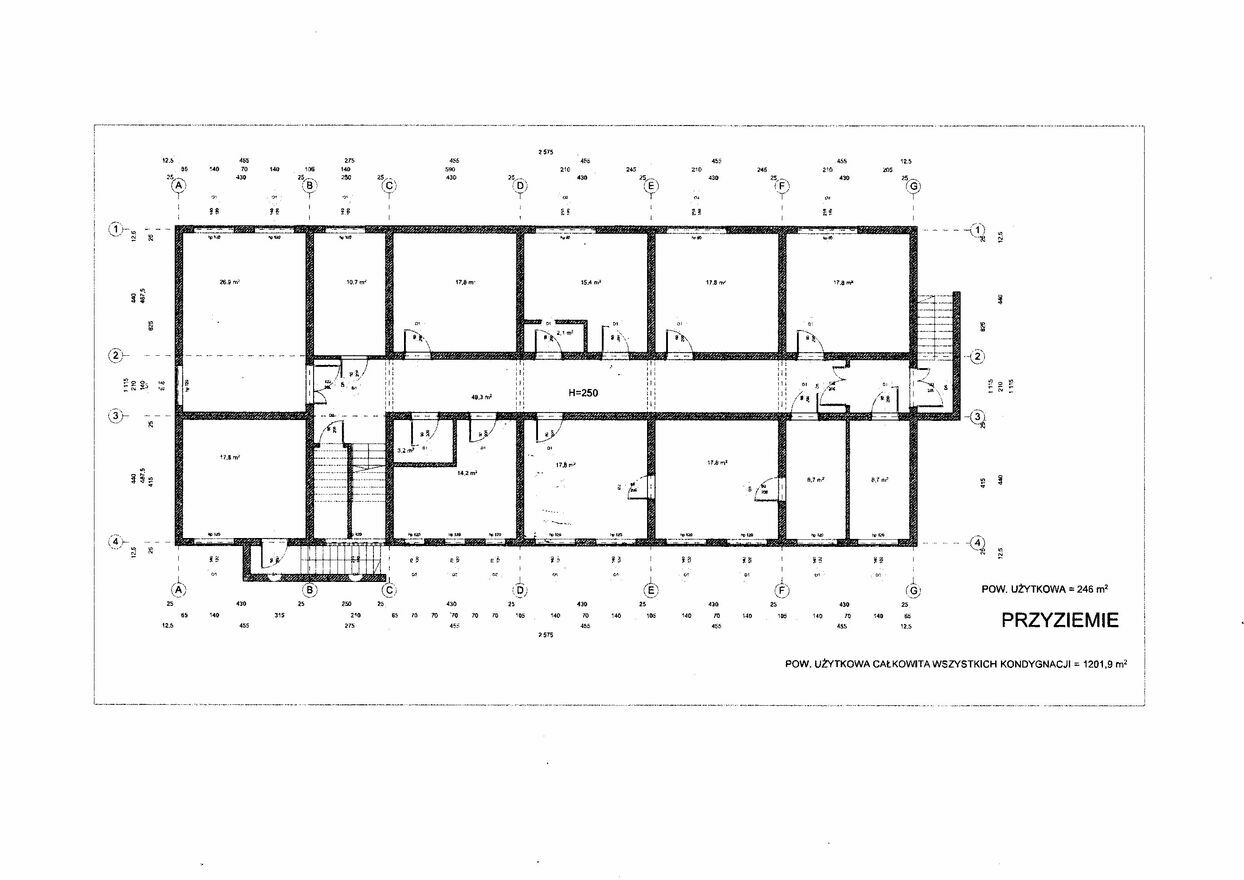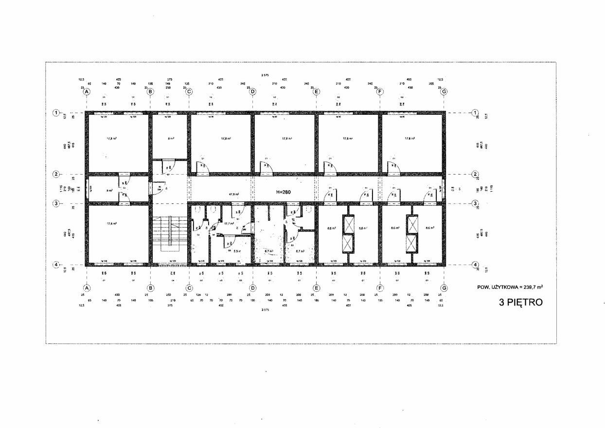 • budynek czterokondygnacyjny -4. piętra ( wys. 2,80 m )+ użytkowa kondygnacja piwniczna-( o wys. 2,5 m) o powierzchni 1250 m2